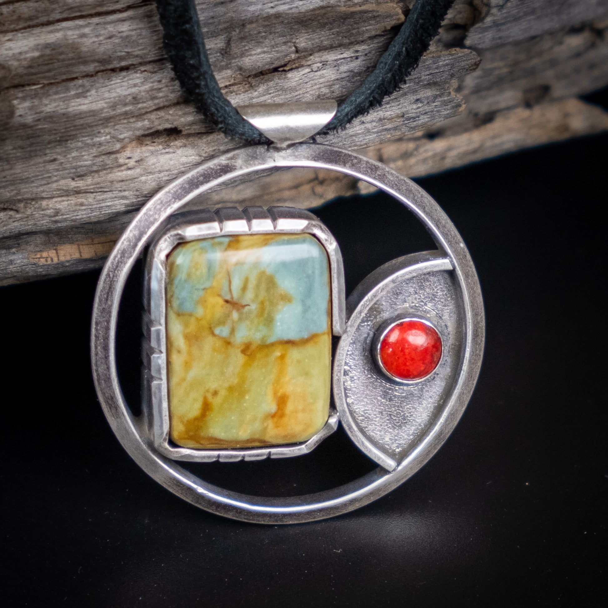 symmetric geometry meets natural color theory. This pendant plays with balance and negative space, anchoring a substantial Gary Green jasper stone alongside a vivid red coral accent within a circular sterling silver frame.